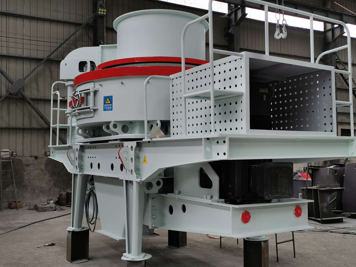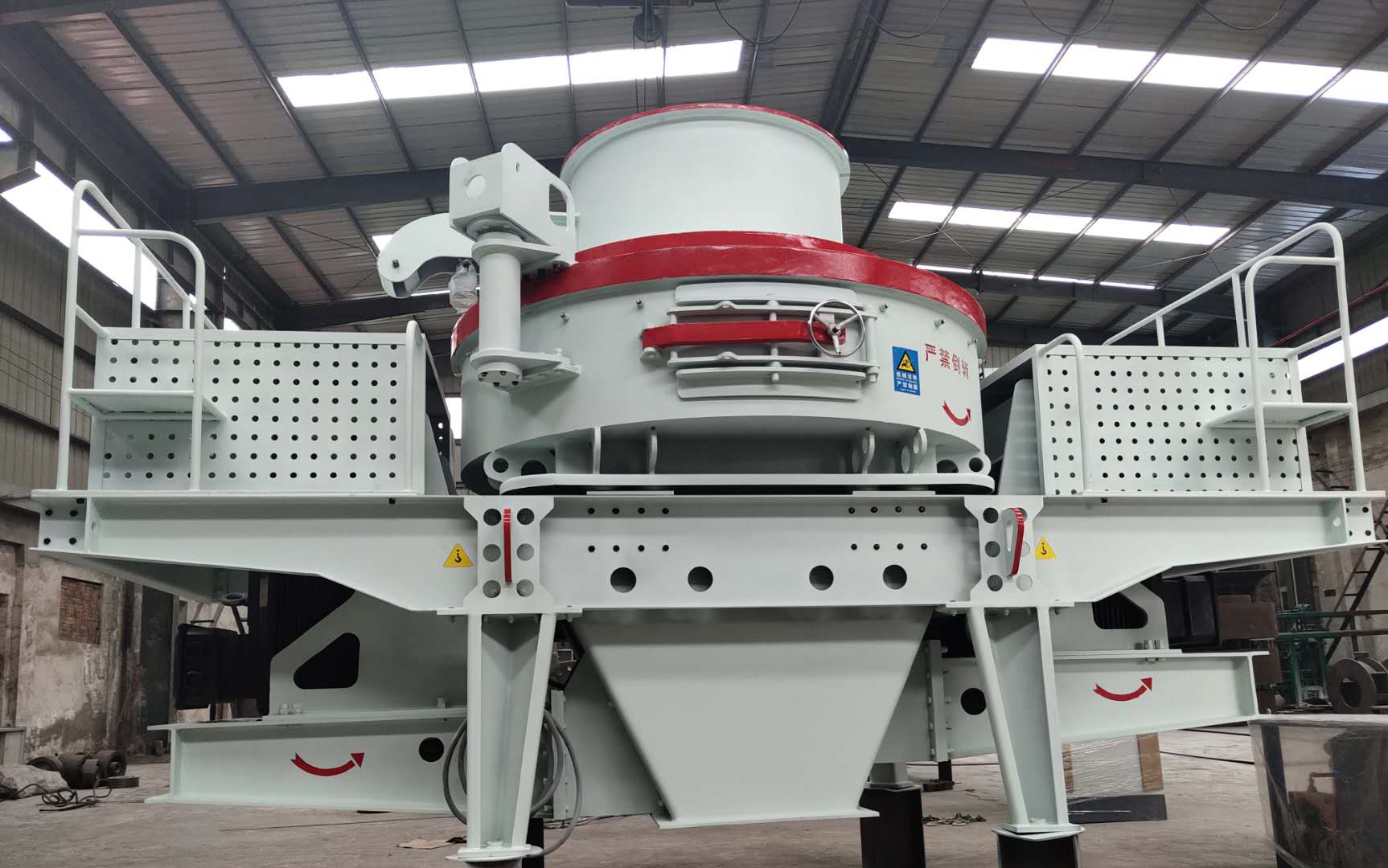 安裝時應(yīng)將沖擊式制沙機(jī)調(diào)平使其主軸與水平面垂直。碎石機(jī)上方應(yīng)設(shè)置起吊設(shè)備,起吊設(shè)備能力按制沙機(jī)重量考慮,在制沙機(jī)上方應(yīng)留有起吊空間,在制沙機(jī)一側(cè)留適當(dāng)空間,以備檢修時用。